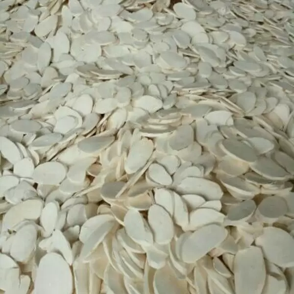The inside of the cassava slice is white and slightly yellow, and it is very hard when you hold it by hand, which means that the cassava has been dried.