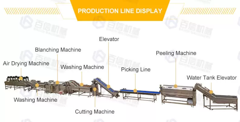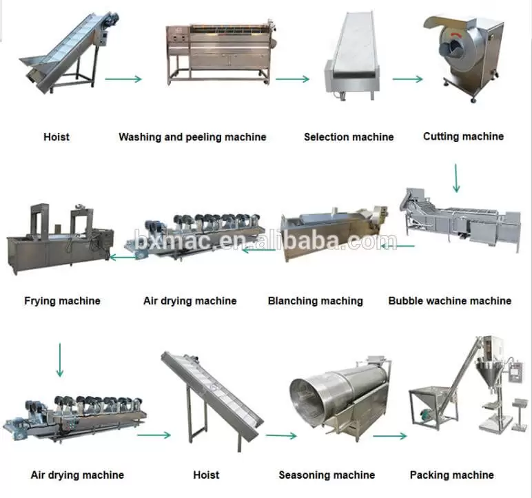 This fully automatic potato chips production line is specially designed for processing raw potatoes into delicious potato chips, potato crisps, or French fries, you could also make Frozen French fries (equipped with a freezer). It has some advantages such as, large capacity, large output, high degree of automatic, labor-saving, and high return rate.